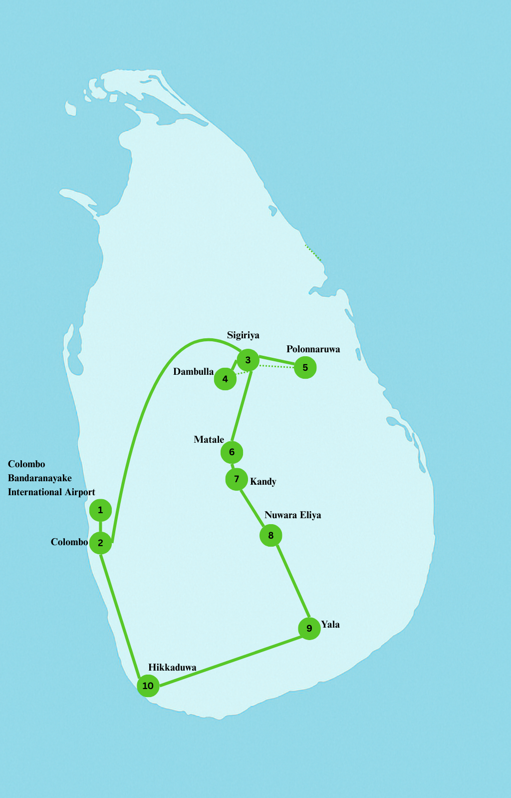 Colombo/ Sigiriya/ Dambulla/ Polonnaruwa/ Matale/ Kandy/ Nuwara Eliya/ Yala/ Hikkaduwa