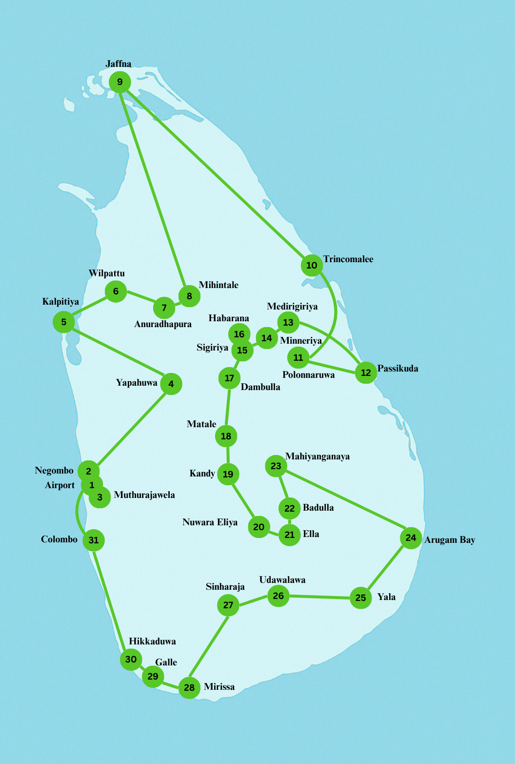 Negombo/ Muthurajawela/ Yapahuwa/ Kalpitiya/ Wilpattu/ Anuradhapura/ Mihintale/ Jaffna/ Trincomalee/ Polonnaruwa/ Passikuda/ Medirigiriya/ Minneriya/ Sigiriya/ Hiriwadunna/ Aukana/ Habarana/ Ritigala/ Dambulla/ Matale/ Kandy/ Pinnawala/ Peradeniya/ Ramboda/ Nuwara Eliya/ Ella/ Haputale/ Badulla/ Mahiyanganaya/ Arugambay/ Yala/ Udawalawa/ Sinharaja/ Mirissa/ Galle/ Hikkaduwa/ Colombo
